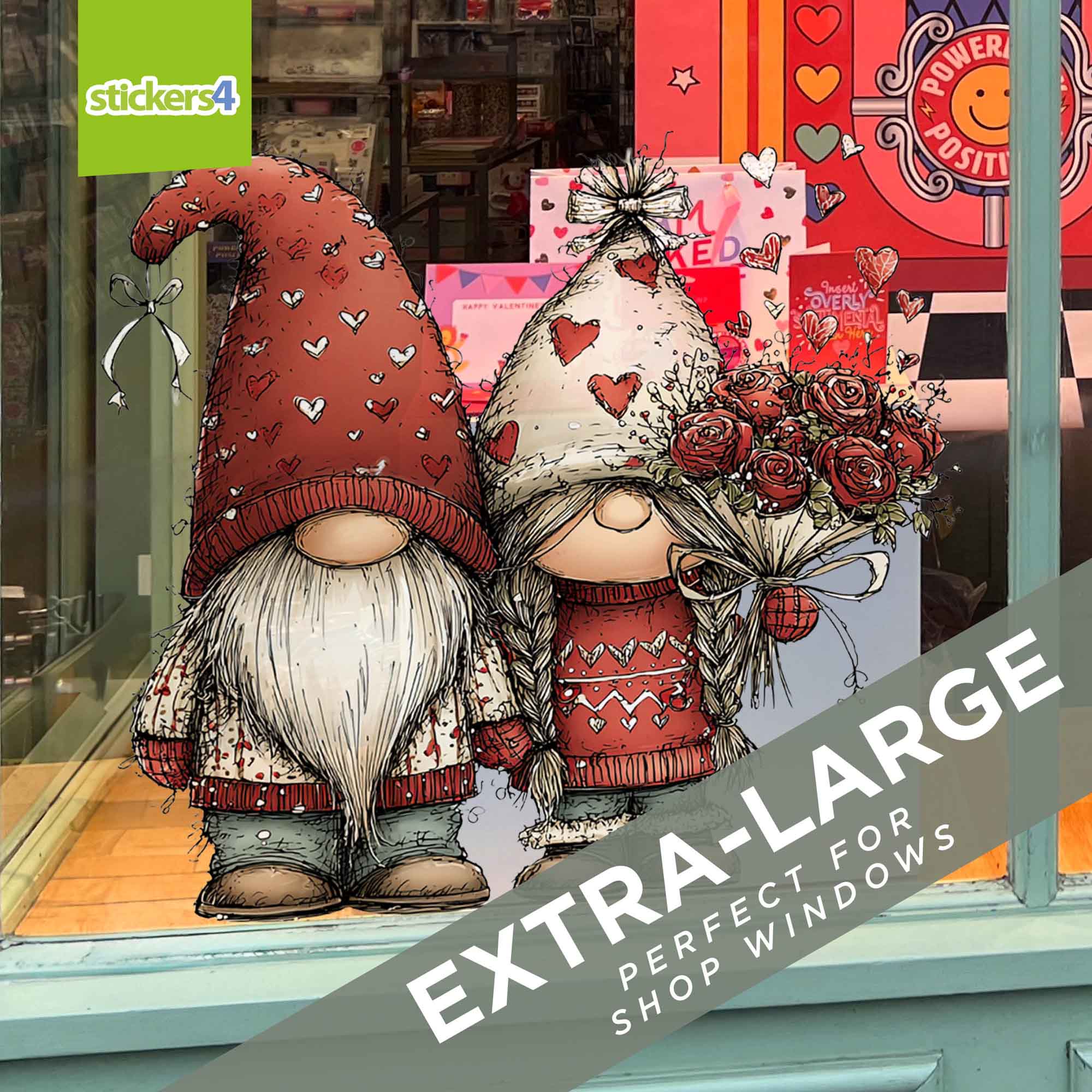 Hand-sketched with intricate detail, this design captures a sweet moment as they hold hands surrounded by floating love hearts. It is the perfect decoration for Valentine’s Day, Mother's Day, or simply to welcome Spring with a splash of "Floral Love". Whether you are dressing a home window to delight the neighbours or creating an inviting shop front display, these gnomes add a cosy, romantic feel to any glass surface.