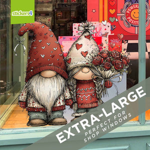 Bloom with romance this season with our delightful Gnome Couple with Roses Window Sticker. This affectionate pair of "Gonks" is dressed to impress: he wears a charming red hat scattered with white hearts, while she dons a cream hat with red hearts and clutches a bountiful bouquet of red roses.