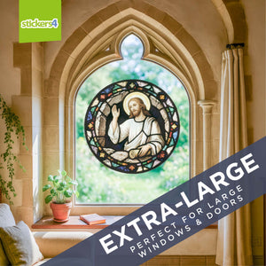 This Christian stained glass window cling is best viewed from inside, where daylight enhances its radiant colours. It can also be enjoyed from outside when interior lighting is bright or when displayed on a back-lit surface. Printed on premium static cling vinyl – no glue, no mess – and completely safe for all smooth glass surfaces.